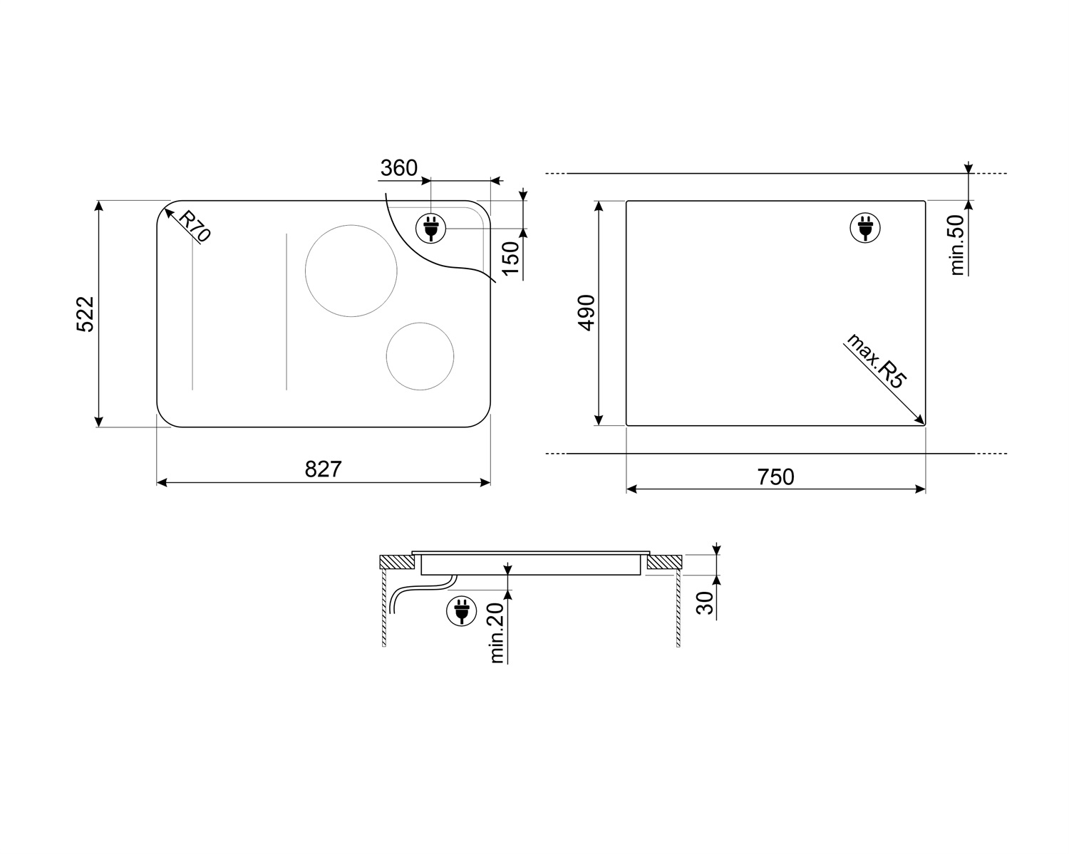Схема встраивания для варочной панели Smeg SISL7844MB