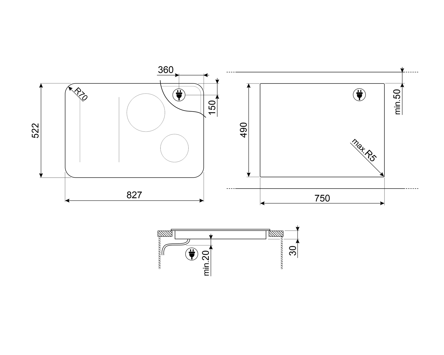 Схема встраивания для варочной панели Smeg SISL7844X