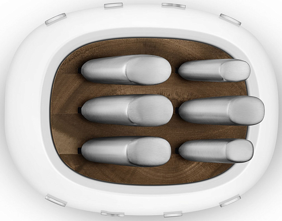 Визуально набор смотрится презентабельно: чистая цветовая гамма, гладкие фаски и аккуратные грани подчёркивают современную стилистику, а фактура древесины врезается контрастным акцентом, смягчая облик. Такая композиция помогает интегрировать прибор в современные и классические кухни, а компактные габариты позволяют избежать загромождения. Функционал предусматривает универсальность при обработке продуктов различной текстуры — от мягких плодов до плотного мяса и корок хлебобулочных изделий. Каждое лезвие оптимизировано под свой вид применения, поэтому пользователю не приходится подбирать универсальные компромиссы; вместо этого доступна серия специализированных решений, собранных в одном блоке.
