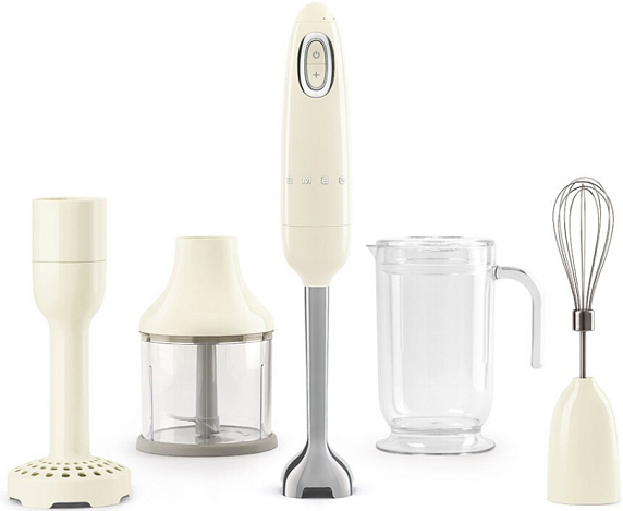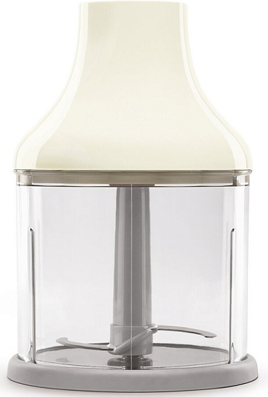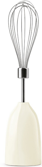 Блендер Smeg HBF22CREU выполенен в кремовом цвете в стиле 50-х годов. Дизайн прекрасно подчернет ретро интербер. В комплекте прилагается универсальный измельчитель для переработки орехов, зелени и прочих трудных для перемалывания ингредиентов. Венчик для взбивания из нержавеющей стали подойдет для смешивания воздушных кремов или теста.
