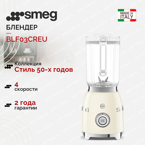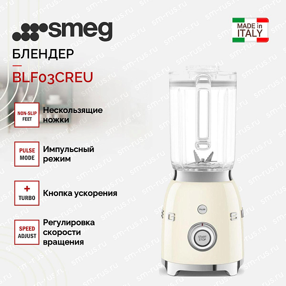 Блендер Smeg BLF03CREU имеет 4 предустановленные программы и 4 режима работы среди них , есть импульсный. Управление осуществляет с помощью поворотного регулятора, на нем отображаются все функции. Благодаря противоскользящим ножкам, устройство будет устойчиво стоять на столе.