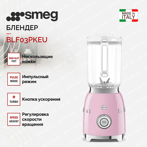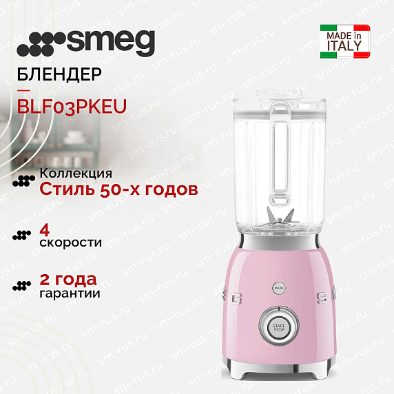 Блендер Smeg BLF03PKEU — это стационарная модель, которая отличается стильным дизайном в духе 50-х годов. Это качественная итальянская бытовая техника, которая будет служить вам долгие годы. Модель имеет гарантию на 24 месяца, что подтверждает ее надежность и долговечность.