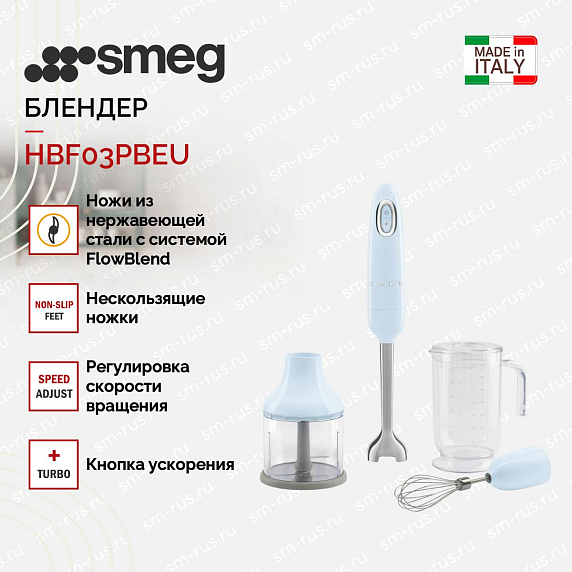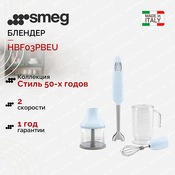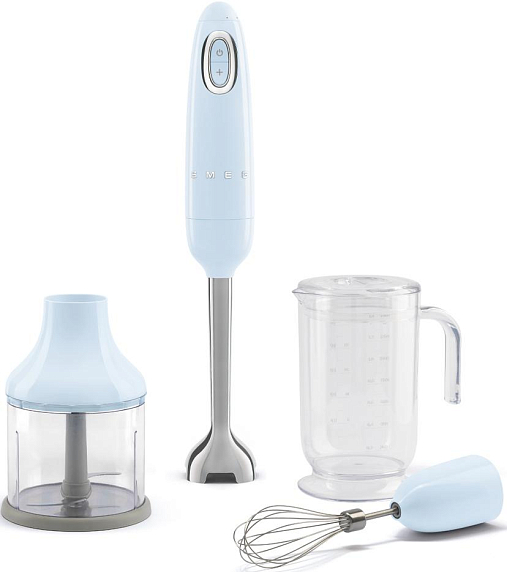 Блендер Smeg HBF03PBEU — это элегантное и функциональное устройство, которое придется по вкусу любителям стиля 50-х годов. Благодаря своему пастельно-голубому цвету и уникальному дизайну, этот прибор станет настоящим украшением любой кухни. Корпус выполнен из высококачественного пластика, а погружная часть — из нержавеющей стали, что обеспечивает его долговечность и надежность в использовании.