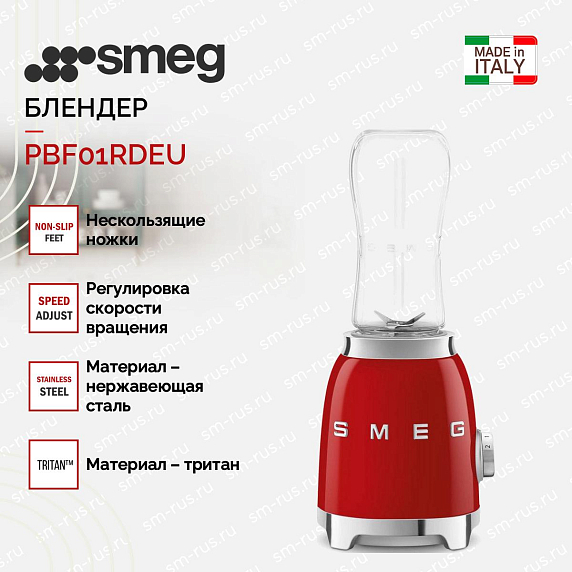 Блендер PBF01RDEU представлен в красном цвете в стиле 50-х годов. Корпус прибора выполнен из нержавеющей стали, что гарантирует долговечность эксплуатации. Устройство работает на двух скоростях с максимальным вращением 24000 об./мин. Безопасность использования обеспечивается за счет автоматического отключения при перегрузке двигателя.