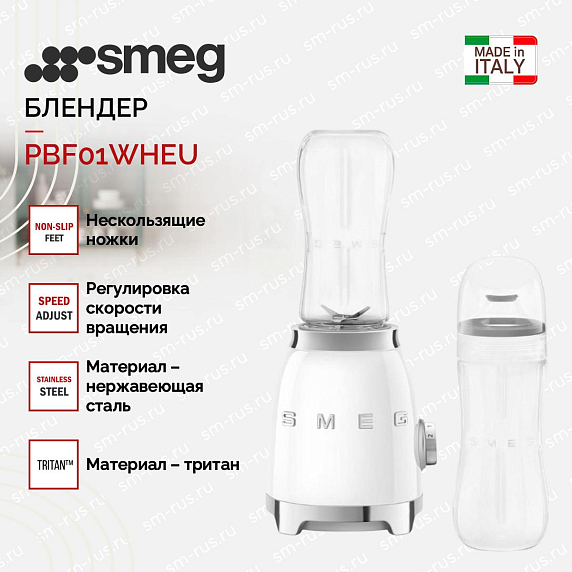 Блендер PBF01WHEU выполнен в белом цвете в стиле 50-х годов с глянцевым покрытием и хромированными манжетами. В комплекте прилагается бутылка, которая сделана из пластика без вредных химических соединений. Блокировка вращения при поднятой смесительной головке обеспечит дополнительную защиту.