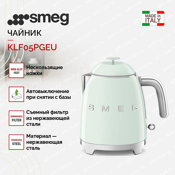 Электрический чайник SMEG KLF05PGEU выполнен в пастельных тонах зеленого цвета и отлично дополнит интерьер светлой кухни. Это устройство надежно и долговечно, поскольку его внутренний корпус изготовлен из прочной легированной стали, устойчив к загрязнениям, высоким температурам и не подвержен ржавчине. Этот материал прост в использовании и требует небольших усилий по очистке.
