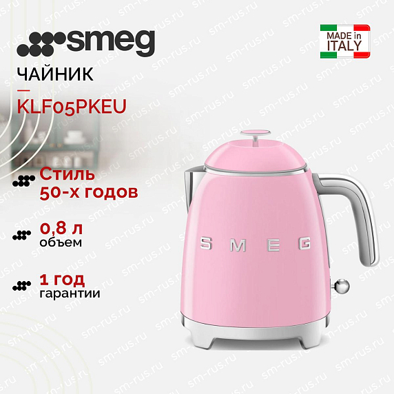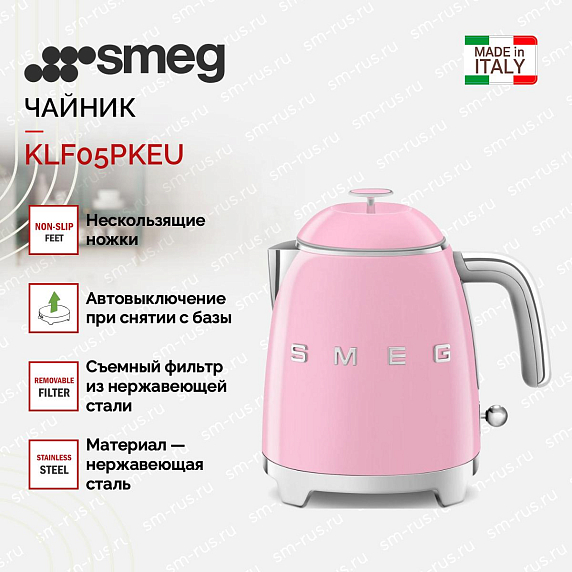 Электрический чайник SMEG KLF05PKEU выполнен в розовом цвете и отлично дополнит интерьер светлой кухни. Это устройство надежно и долговечно, поскольку его внутренний корпус изготовлен из прочной легированной стали, устойчив к загрязнениям, высоким температурам и не подвержен ржавчине. Этот материал прост в использовании и требует небольших усилий по очистке.