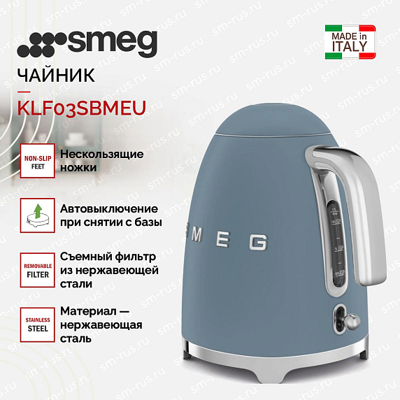 Электрический чайник Smeg KLF03SBMEU – это сочетание стиля 50-х годов и современных технологий. Этот аппарат, выполненный в синем штормовом цвете, станет ярким акцентом на вашей кухне. Корпус из нержавеющей стали придает устройству прочность и долговечность, а также обеспечивает легкую очистку от загрязнений.