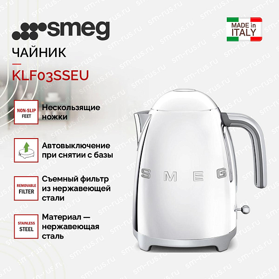 Электрический чайник Smeg KLF03SSEU выполнен из отполированной стали, благодаря чему модель органично впишется в любой современный интерьер. Прибор отключается в случае достижения температуры в 100°С, а также при снятии с базы и во время отсутствия воды в чайнике. Крышка открывается мягко, в базе предусмотрено специальное отделение для шнура. Нескользящие ножки обеспечивают надежную устойчивость.