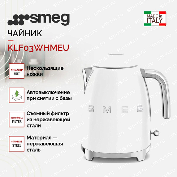 Электрочайник Smeg KLF03WHMEU идет в белом матовом цвете. Это классическая модель из 50-й серии, корпус сделан из нержавейки, покраска качественная. Матовое покрытие практичное — на нем меньше заметны отпечатки пальцев, чем на глянце. Объем стандартный, 1.7 литра, этого за глаза хватает на большую семью.