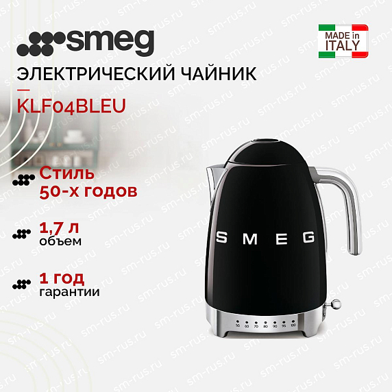 Модель SMEG KLF04BLEU — это электрический чайник в чёрном цвете. Дизайн у него под стиль 50-х годов, такие обычно называют ретро. Корпус сделан из полированной нержавейки, сплав твёрдый, так что коррозии не будет.