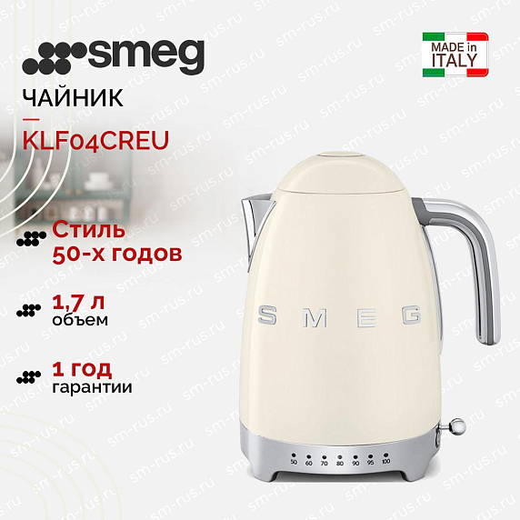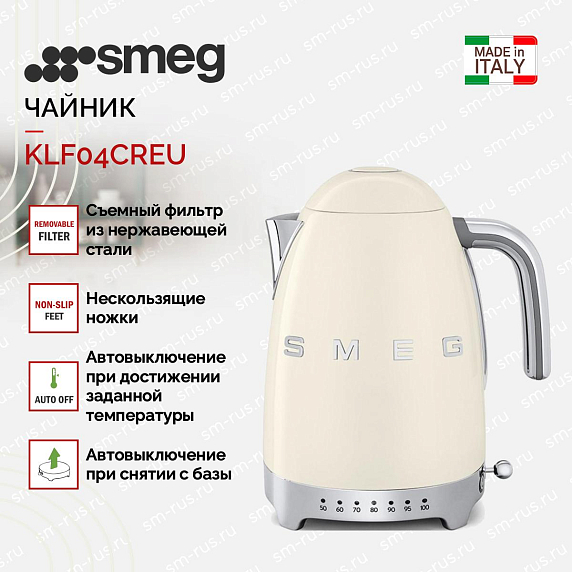 Чайник Smeg KLF04CREU, цвет кремовый. Модель из ретро-серии, под стиль 50-х. Корпус из полированной нержавейки, сплав твердый — не ржавеет, царапины не так заметны, как на глянце.