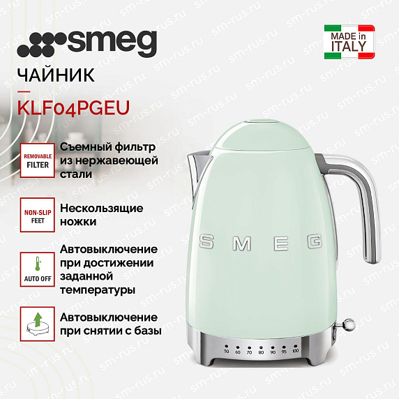 Электрический чайник Smeg KLF04PGEU из коллекции «стиль 50-х» выполнен из нержавеющей стали в пастельно-зеленом цвете. Внутренняя емкость составляет 1.7 литра, а поворотная база ограничивается 360 градусами. Прибор автоматически отключается в случае снятия с базы, а также при отсутствии воды. Эргономичная конструкция прибора предусматривает мягкое открывание крышки и нескользящие ножки для надежной устойчивости. Регулировка температуры осуществляется в диапазоне от 50 до 100°. Стальной фильтр легко снимается для очистки.