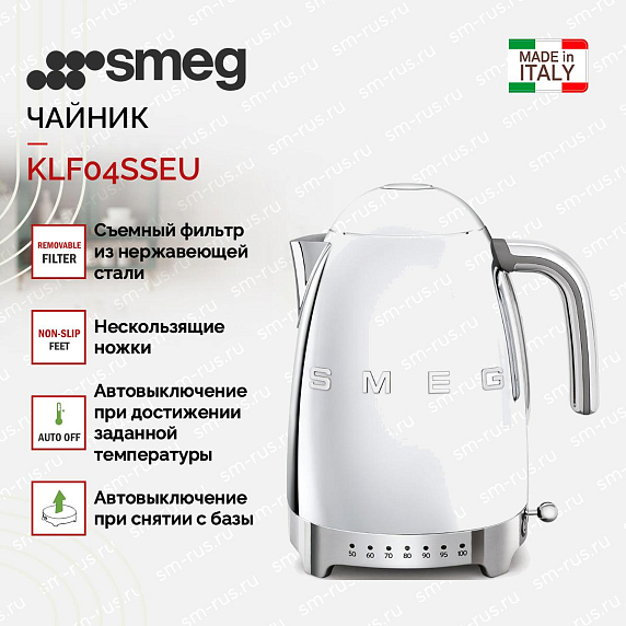 Электрический чайник Smeg KLF04SSEU имеет возможность регулировки температуры в пределах от 50 до 100°С. Прибор автоматически выключает в случае снятия с базы, а также при достижении температуры в 100°С. Корпус модели выполнен из отполированной нержавеющей стали, что придает чайнику определенный стиль. В базе предусмотрен отсек для хранения шнура.