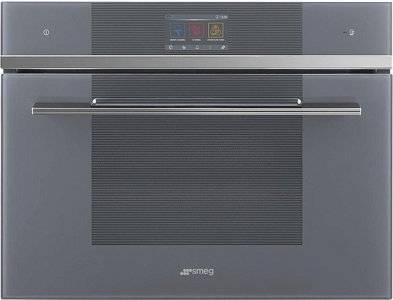 Компактный духовой шкаф Smeg SF4104WMCS имеет серебристую фурнитуру и такое же по цвету стекло с покрытием StopSol. Управление осуществляется двумя способами: через сенсорные кнопки на цветном TFT-дисплее и дистанционно через приложение SmegConnect. Оно позволяет контролировать работу духовки и менять настройки, не отвлекаясь от дел или находясь в дороге.