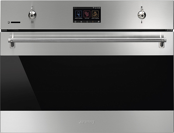 Отличительные новшества Смег SF4303WMCX — микроволны, а также управление не только через сенсорный дисплей, но через приложение SmegConnect. Установите его на мобильное устройство и осуществляйте регулировку прибора дистанционно. Вы можете поменять настройки или включить духовку по пути домой, чтобы пища приготовилась к вашему приходу. Также готовку по времени или начало в определённое время предлагает таймер. Его можно выставить до 13 часов. Пятьдесят шесть программ уже установлены, а шестьдесят дополнительных можно внести по желанию.