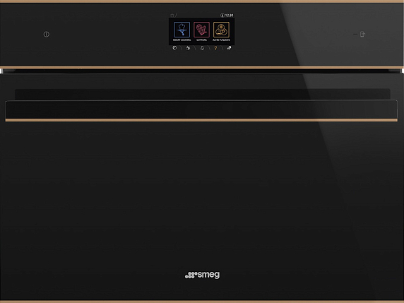 Электрический компактный духовой шкаф с функцией СВЧ Smeg SF4604WMCNR из дизайнерской линейки Dolce Stil Novo имеет медный профиль и корпус из чёрного антибликового стекла Eclipse.