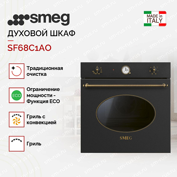 Духовой шкаф Smeg SF68C1AO из коллекции Coloniale в благородном антраците с латунной фурнитурой создаёт выразительный визуальный акцент, который удачно сочетает винтажную эстетику и современную точность исполнения. Плавные линии фасада и тёплый металлический оттенок ручек придают изделию ощущение предмета интерьера, а не просто бытового прибора, что особенно ценно для камерных кухонь и зон, оформленных в ретро-стиле. Матовая поверхность корпуса легко вписывается в различные палитры декора, а контраст латунных деталей подчёркивает статусность и лад в общей композиции.