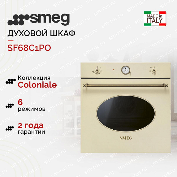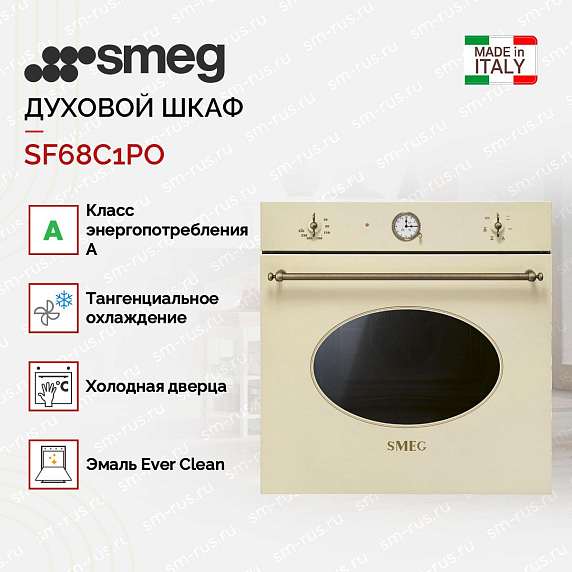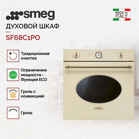 Духовой шкаф Smeg SF68C1PO шириной 60 см из коллекции Coloniale привносит в кухонное пространство изысканный образ благодаря нежному кремовому оттенку корпуса и латунной фурнитуре. Внешний вид выполнен в ретро-стиле с аккуратными линиями и мягкими формами, которые гармонично сочетаются с современными материалами и традиционной отделкой. Модель подчёркивает атмосферу уюта и благородства, создавая эффект предмета мебели, а не просто бытового прибора; она легко вписывается в классические и эклектичные интерьеры, становясь частью визуального ансамбля. Продуманная цветовая гамма и тёплый металлический акцент делают прибор центром композиции, привлекая внимание к зоне готовки без излишней напыщенности.