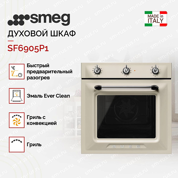 Полноразмерный духовой шкаф Smeg SF6905P1 имеет стандартную для встроенной техники ширину 60 см и полезный объём 70 л. Электрический способ подключения даёт широкие возможности в приготовлении.