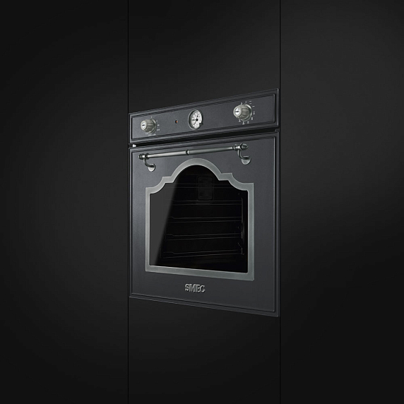 Духовой шкаф Smeg SF750AS цвета антрацит и фурнитурой под состаренное серебро станет отличным украшением для стильного и строгого интерьера кухни. Электрическая духовка имеет высокий класс энергоэффективности.