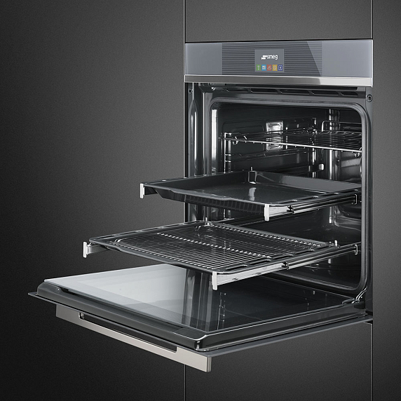 Духовой шкаф Smeg SFP6104TVS серебристого цвета из серии Linea оборудован TFT-дисплеем, который наглядно отображает ход работы устройства. Настройка режима и температуры осуществляется посредством сенсорных переключателей. Четырехслойное остекление дверцы исключает вероятность получения ожогов, выдерживает высокие температуры, благодаря чему духовка имеет функцию пиролитической очистки.