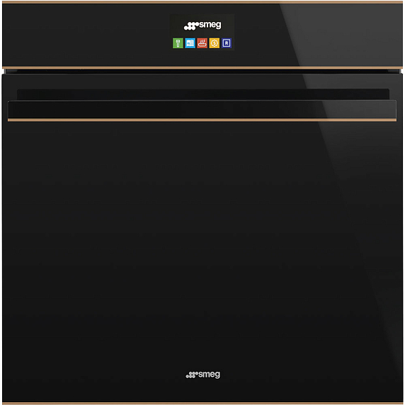 Духовой шкаф Smeg SFP6604STNR в цвете «черное стекло» дополнен медными планками, что является основным лейтмотивом коллекции Dolce Stil Novo. Модель имеет большой набор режимов и опций для удобства использования. Очистка осуществляется пиролитическим способом, благодаря чему все загрязнения за короткий срок превращаются в пепел. С внешней стороны корпуса расположен цветной дисплей, который упрощает настройку работы.