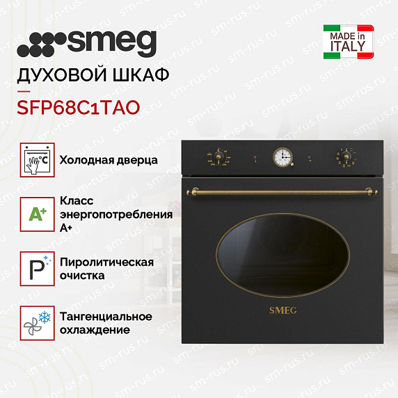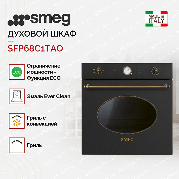 Духовой шкаф Smeg SFP68C1TAO выполнен в коллекции Cortina и подчёркивает эстетический вкус сочетанием антрацита с латунной фурнитурой: строгие линии фасада дополнены аккуратными вращающимися рукоятками и аналоговым программатором, создавая ретро‑нотку в современной кухне. Корпус шириной 60 см скрывает просторную камеру объёмом 63 л, рассчитанную на пять уровней готовки; внутри применяется эмаль Ever Clean, устойчиво удерживающая загрязнения и облегчающая обслуживание после интенсивной эксплуатации. Для управления доступны девять режимов, включая традиционные верхний и нижний нагревы, гриль, гриль с конвекцией, кольцевой и турборежимы, а также ECO‑режим — функция ограничения мощности для экономии энергии. Диапазон температур 50–250 °C подходит для выпечки, запекания и золотистой корочки; мощность основного нагревателя 3 кВт, гриля 2,7 кВт, при стандартном подключении 220–240 В и силе тока 13 А.