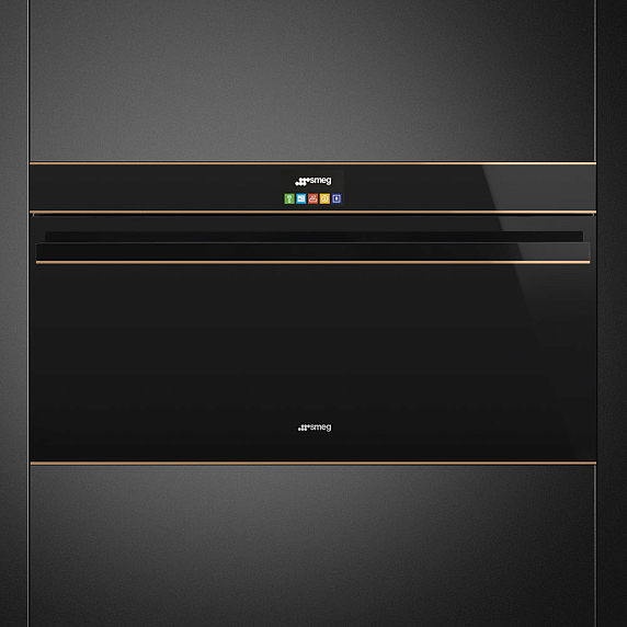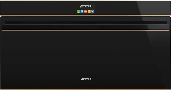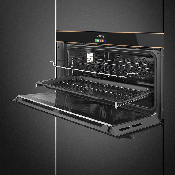 Духовой шкаф Smeg SFPR9604NR относится к высокотехнологичной линейке Dolce Stil Novo. Тонкий медный профиль оттеняет чёрное стекло Eclipse, которое не даёт бликов. TFT-дисплей отображает выставленные настройки. Таймер издает звуковой сигнал по прекращении отведенного на готовку времени. Также можно поставить отложенный старт. Два последних режима можно запрограммировать до 24 часов.