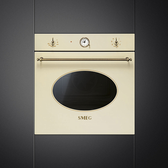 Духовой шкаф Smeg SFT805PO выполнен в нежном кремовом цвете. Ретро - стиль дополняют латунные поворотные переключатели, ручка, таймер, символьные обозначения и обводка. Стекло у устройства — тройное, внутреннее при этом сплошное. Это означает, что оно защищает пользователей от исходящего жара, а также его можно снять для мытья в посудомоечной машине.