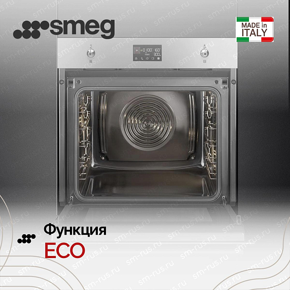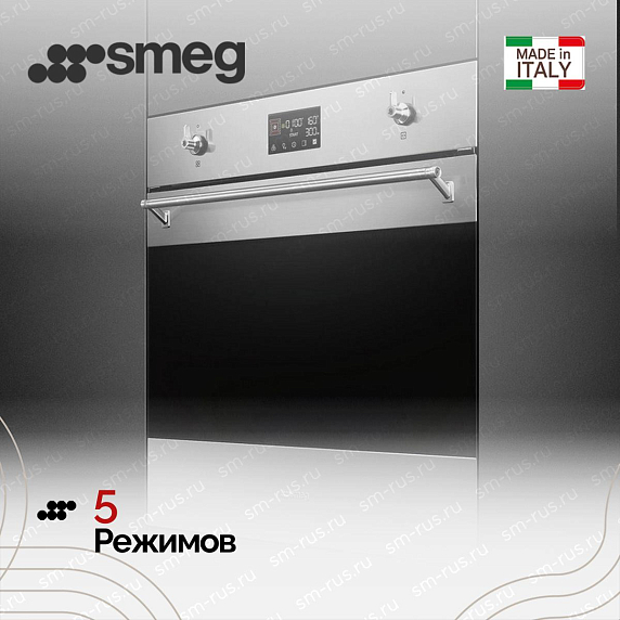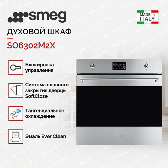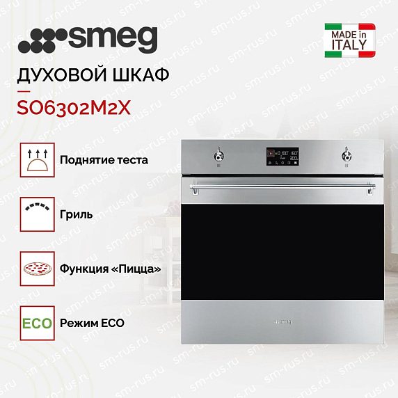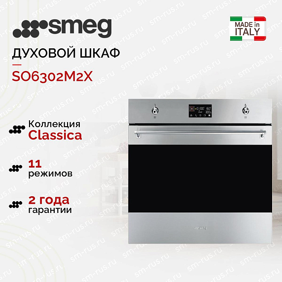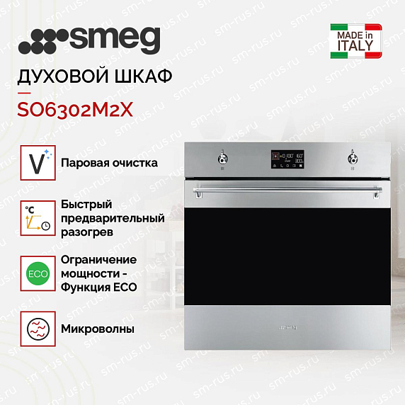 Духовой шкаф Smeg SO6302M2X из коллекции Classica выполнен в цвете «Нержавеющая сталь» с черным стеклом Eclipse. Прибор предусматривает в себе 11 различных режимов, в том числе — 4 с использованием микроволн. На ярком дисплее комфортно и понятно отображается вся необходимая информация — режим, время, выбранная температура, благодаря чему следить за приготовлением стало еще проще.