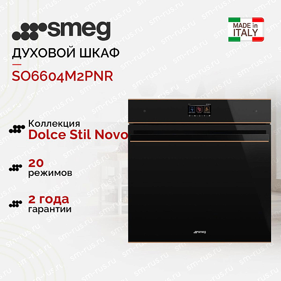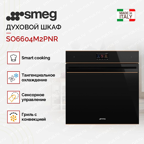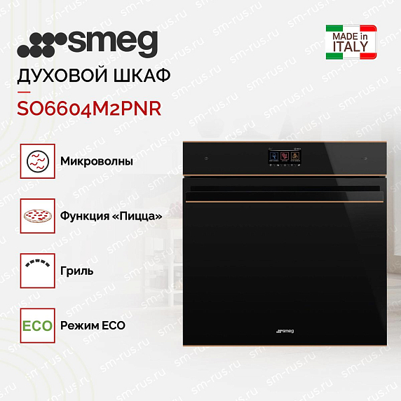 Духовой шкаф SMEG SO6604M2PNR — это высококачественное и функциональное оборудование, которое воплотило в себе передовые технологии и элегантный дизайн. Изготовленный в Италии, он представляет собой сочетание черного цвета и медной фурнитуры, что придает ему стильный и современный вид.