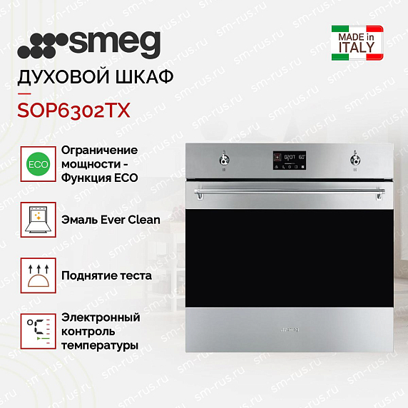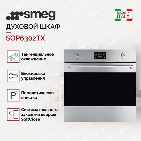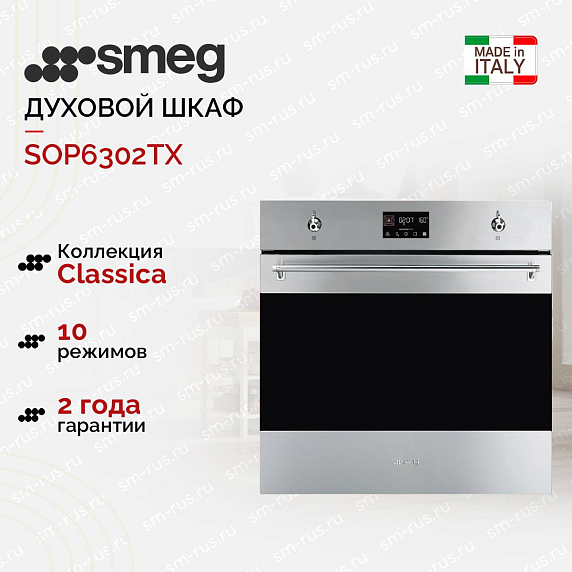 Духовой шкаф Smeg SOP6302TX из коллекции Classica представлен в цвете «Нержавеющая сталь». Модель оборудована удобным управлением при помощи двух переключателей и LCD дисплея, на котором отображается выбранный режим, время работы и установленные функции. Отложенный старт позволяет перенести старт программы.