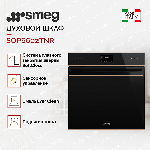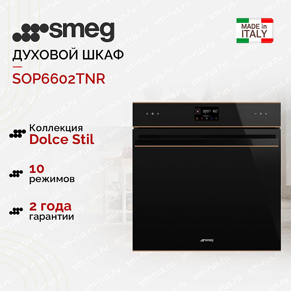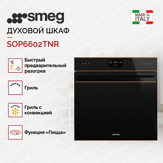 Духовой шкаф Smeg SOP6602TNR — это высококачественное устройство, произведенное в Италии, которое отличается своим стильным дизайном и функциональностью. Это полноразмерное устройство шириной 60 см, выполнено в черном цвете с медным профилем, что придает ему элегантный и современный вид.