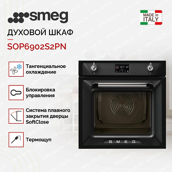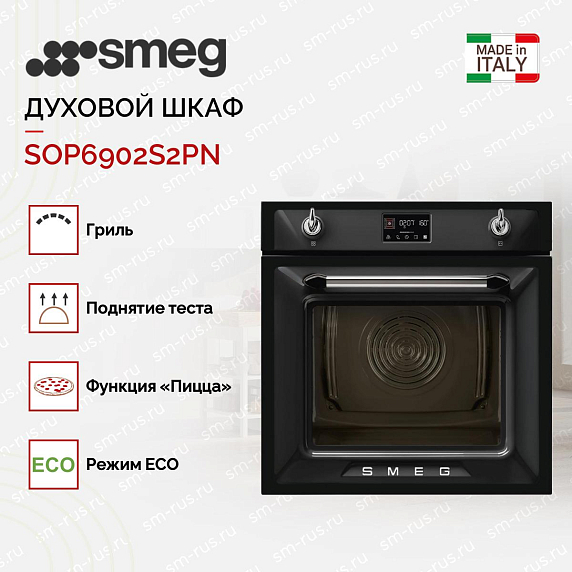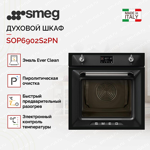 Духовой шкаф Smeg SOP6902S2PN из коллекции Victoria выполнен в классическом черном цвете. Удобное управление при помощи дисплея с сенсорными кнопками и двух поворотных переключателей позволяет быстро настроить все необходимые параметры — выбрать режим нагрева, установить температуру, время приготовления. Пиролитическая система очистки максимально упрощает уход за камерой — по окончании работы программы остается только протереть пепел мягкой тряпкой.