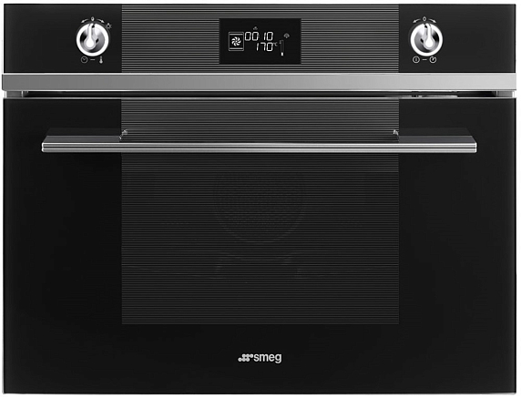 Электрический компактный духовой шкаф Smeg SF4102VCN относится к одной из высокотехнологичных линеек Linea. Чёрное стекло фасада удачно сочетается с серебристой фурнитурой из поликарбоната с подсветкой и с LCD-дисплеем. Таймер можно выставить на отложенный старт от 1 минуты до 13 часов, на только звуковое оповещение — до 4 часов. Прибор готовит при температуре от 30 до 250 градусов, за стабильность отвечает электронный контролер.