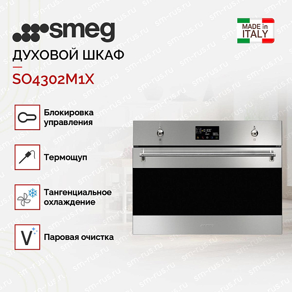 Компактный духовой шкаф с пароваркой Smeg SO4302M1X выполнен в цвете «нержавеющая сталь» и помимо традиционного нагрева, оснащен также микроволнами. Защита от отпечатков пальцев облегчит уход за устройством. Сенсорное управление и жк-дисплей позволят без труда устанавливать необходимую температуру и настройки.