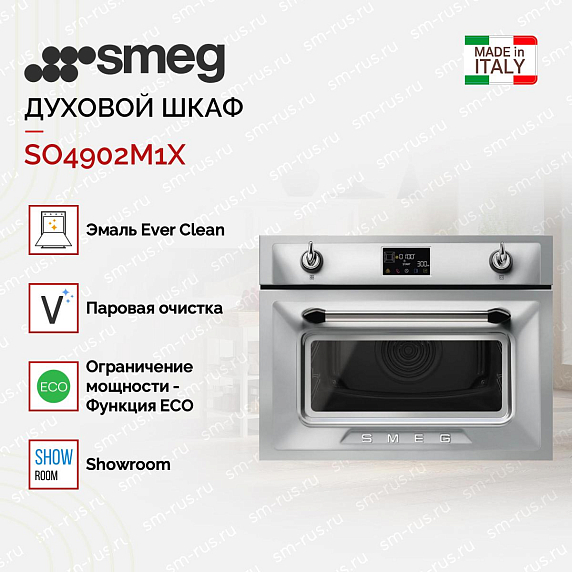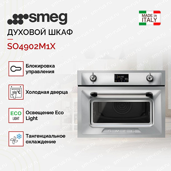 Управление осуществляется через сенсорный дисплей и электронный программатор с функцией запоминания пользовательских рецептов. Технология Smeg Connect позволяет управлять духовкой через смартфон — запускать программы, отслеживать статус приготовления и получать уведомления. Температурный диапазон: 30–250 C — от томления до интенсивного запекания.