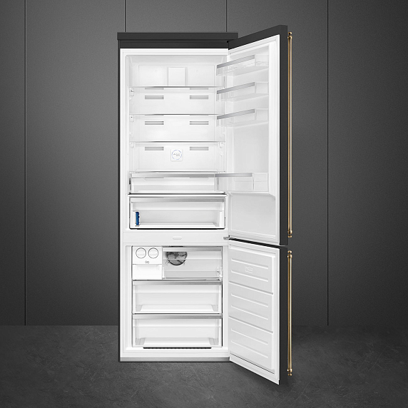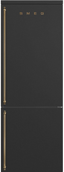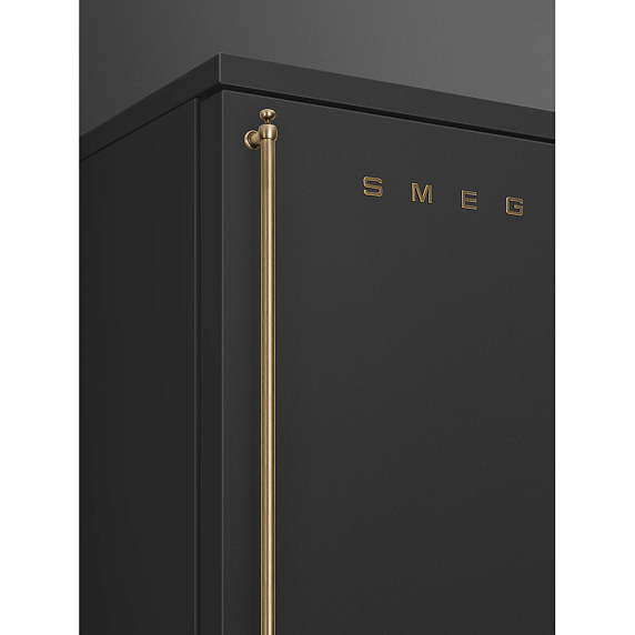 Холодильник Smeg FA8005RAO из коллекции Coloniale выполнен в цвете «Антрацит» и прекрасно дополнит интерьер в стиле ретро. Латунная фурнитура подчеркивает дизайн устройства. Система NoFrost предотвращает образование инея — это означает, что прибор не требуется размораживать. LED-подсветка в холодильной камере расположена сбоку, поэтому она не загораживается продуктами и емкостями и ярко освещает все внутреннее пространство. К тому же она отличается долговечностью.