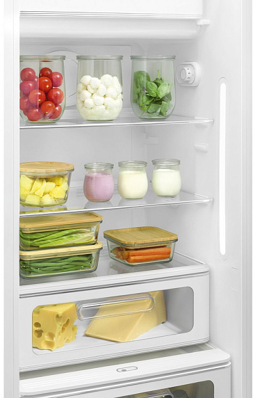 Внутреннее пространство организовано рационально: общий объём 270 литров распределён между холодильной камерой 244 л и морозильной секцией 26 л, расположенной сверху. Такая компоновка удобна для повседневного использования, когда основную часть продуктов размещают в нижней, более вместительной зоне, а быстро замораживаемые продукты помещают в верхний отдел. Холодильная камера оснащена стеклянными полками, среди которых две регулируемые по высоте и одна фиксированная, что позволяет адаптировать планировку под высокий посудный формат или фруктовые ящики. Для овощей и фруктов предусмотрен один ящик, защищающий продукты от пересыхания и сохраняя естественную текстуру. Также есть полка для бутылок и одна регулируемая полка на двери со специальной прозрачной крышкой, что удобно для хранения деликатных продуктов или соусов, требующих защиты от высыпания.