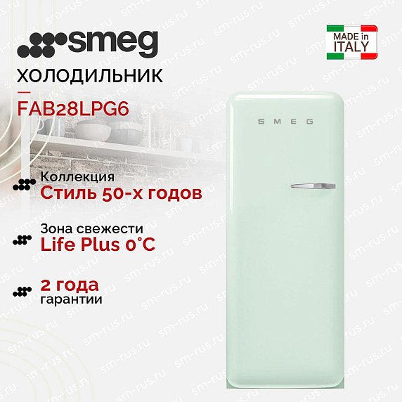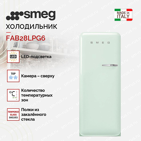 Холодильник Smeg FAB28LPG6 воплощает эстетический идеал пятидесятых в современной реализации: округлые формы, мягкий зелёный оттенок корпуса и аккуратная серебристая фурнитура создают настроение ретро, не теряя практичности. Корпус спроектирован как отдельно стоящий классический прибор, который выглядит как предмет интерьера и одновременно решает задачи хранения продуктов. Высота 153 см при ширине 60,1 см и глубине 72,8 см (78,8 см с ручкой) гарантирует удобство размещения на кухне, а продуманная геометрия фасада делает доступ к внутренним отсекам простым и эргономичным.