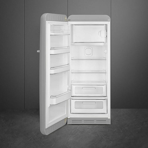 Smeg FAB28LSV6 объединяет ретро-эстетику и современные технологические решения, предлагая выразительный облицованный корпус в сером цвете с аккуратной серебристой фурнитурой, который станет визуальным центром интерьера и гармонично впишется в пространство кухни, оформленное в классическом или винтажном стиле. Высота 153 см и продуманная ширина 60,1 см делают прибор удобным для установки в ограниченной планировке без потери полезного объёма: суммарно доступно 270 литров, из которых 244 литра отведены под область охлаждения и 26 литров — под морозильное отделение, расположенное сверху для быстрого доступа к наиболее востребованным продуктам.
