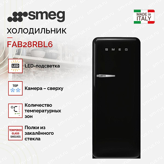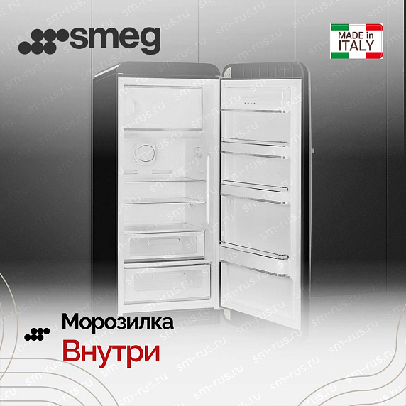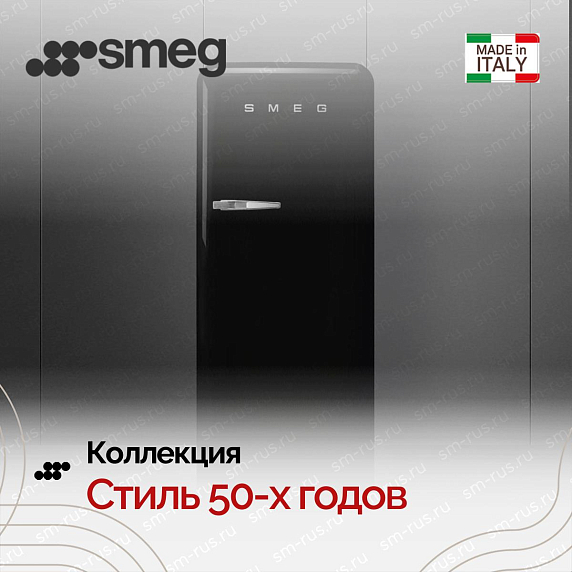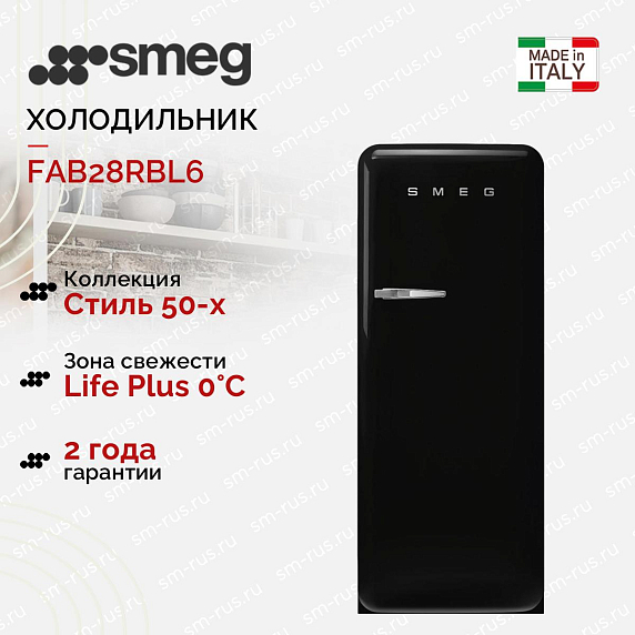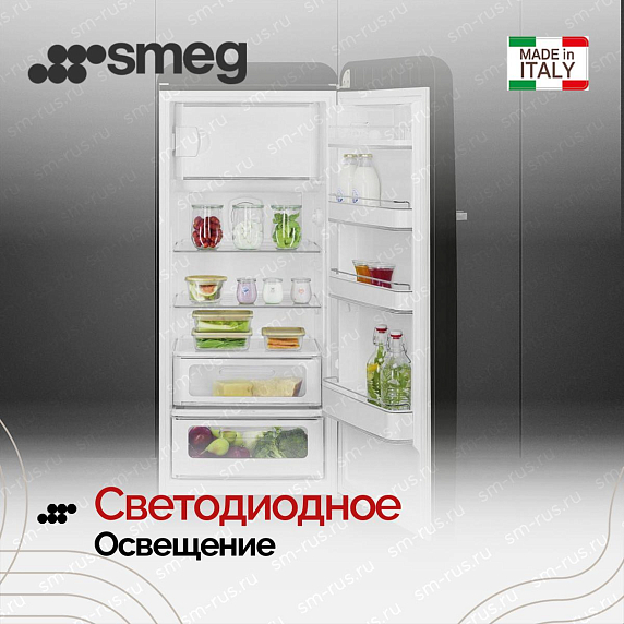 Smeg FAB28RBL6 элегантная ретро-модель в духе пятидесятых годов — сочетание ностальгии и современной техники. Чёрное глянцевое покрытие в паре с серебристой фурнитурой формирует выразительный, но в то же время сдержанный образ, который гармонично впишется в интерьеры от классики до эклектики. Компактные габариты при высоте 153 см и глубине 72.8 см (78.8 см с ручкой) обеспечивают удобную интеграцию в кухонное пространство, не нарушая планировку и оставляя достаточно места для прохода. Пропорции 60.1 см по ширине делают прибор подходящим для небольших помещений, где важны и вместительность, и эстетика.