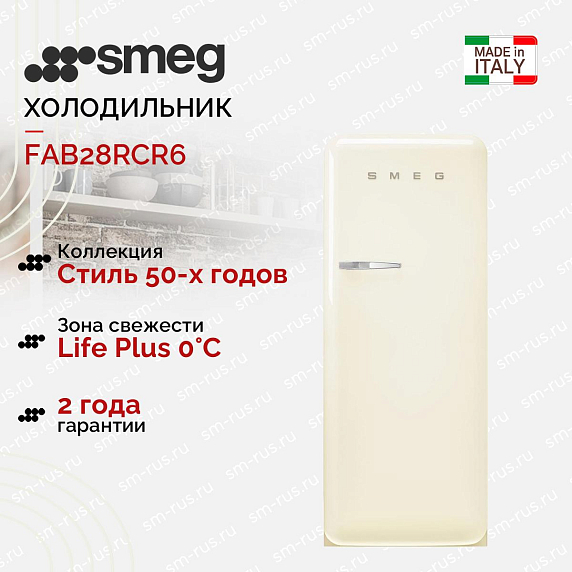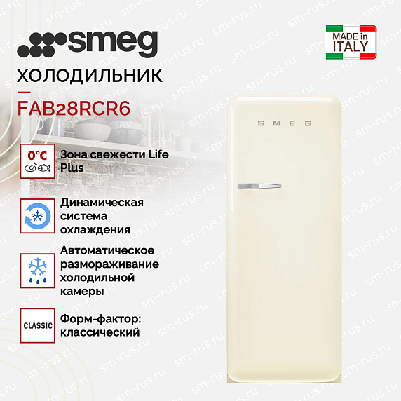 Холодильник SMEG FAB28RCR6 выполнен в бежевом цвете с серебристой фурнитурой и относится к линейке «Стиль 50-х годов». Прекрасно дополнит любой интерьер, особенно решенный в стиле ретро. Модель имеет две регулируемые полки из прочного закаленного стекла. Светодиодная подсветка ярко освещает пространство.