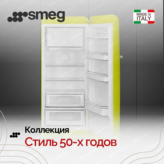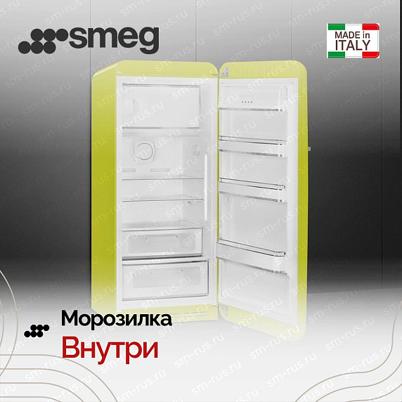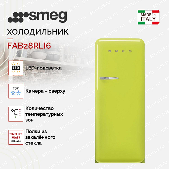 Холодильник Smeg FAB28RLI6 воплощение ретро-эстетики пятидесятых годов, выполненная в насыщенном цвете лайм с аккуратной серебристой фурнитурой, создаёт выразительный дизайнерский акцент и одновременно вписывается в современную кухонную среду. Компактные габариты высотой 153 см, шириной 60,1 см и глубиной 72,8 см (78,8 см с ручкой) делают прибор удобным решением для помещений с ограниченным пространством, а классический форм‑фактор подчёркивает традиционный подход к организации хранения. Корпус сочетает композицию винтажной формы и практичность: округлые линии фасада, аккуратная ручка и приглушённый блеск металлической фурнитуры формируют цельный образ, который привлекает внимание и служит декоративным центром интерьера.