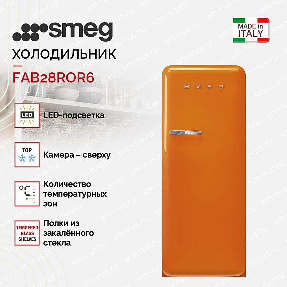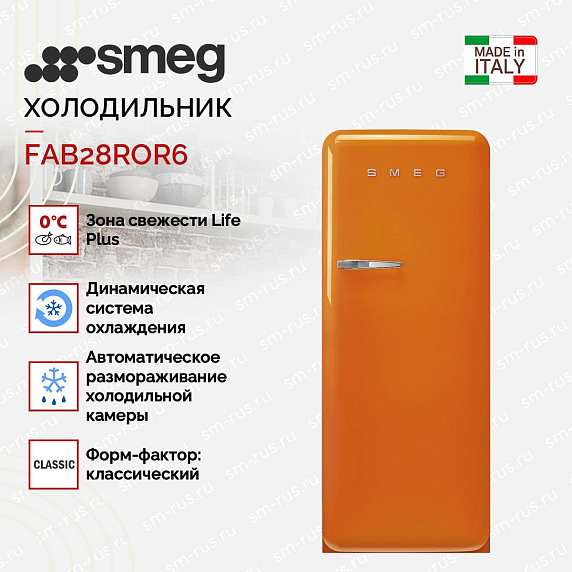 Холодильник Smeg FAB28ROR6 вобрал в себя шарм ретро-эпохи, вдохновлённый эстетикой 50-х годов, и одновременно отвечает современным бытовым требованиям. Лаконичные очертания классического форм-фактора гармонично сочетаются с ярким оранжевым цветом корпуса и аккуратной серебристой фурнитурой, создавая акцент в интерьере и придавая кухне характер. Высота 153 см и продуманная ширина 60.1 см позволяют разместить модель в небольшом пространстве, при этом глубина 72.8 см (78.8 см с ручкой) обеспечивает достаточный внутренний объём для повседневного хранения продуктов. Общий объём составляет 270 литров: холодильная камера вмещает 244 л, морозильная секция — 26 л, что делает устройство удобным для семьи, которая ценит качество и стиль.