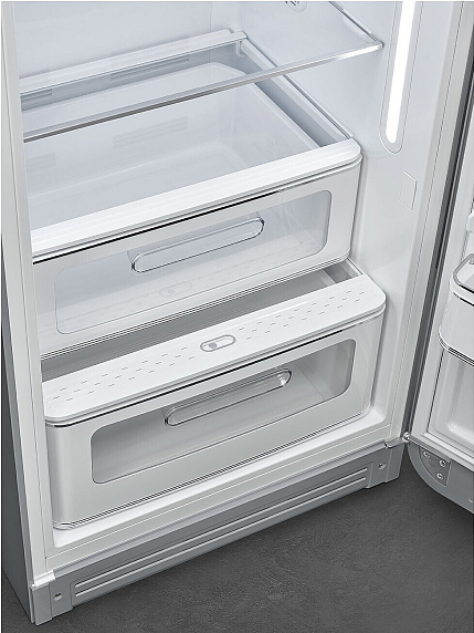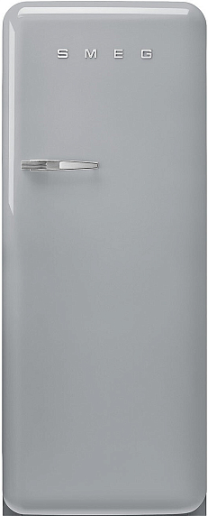 Холодильник Smeg FAB28RSV6 в духе 50-х годов сочетает винтажный характер с современными технологиями. Элегантный серебристый корпус и серебристая фурнитура создают сдержанную, но выразительную внешность, которая органично впишется в интерьер как классической, так и актуальной кухни. Отдельностоящий форм-фактор и классический силуэт подчёркивают аутентичность, при этом компактные габариты — высота 153 см, ширина 60.1 см, глубина 72.8 см (с ручкой 78.8 см) — позволяют разместить агрегат в ограниченном пространстве без ущерба для вместимости. Лаконичные линии фасада и аккуратные хромированные акценты привлекают внимание, но не перегружают обстановку, а продуманная отделка легко поддерживает порядок и презентабельный вид.