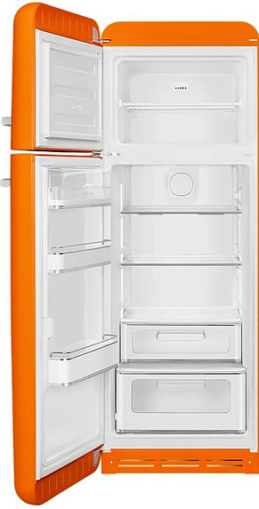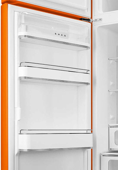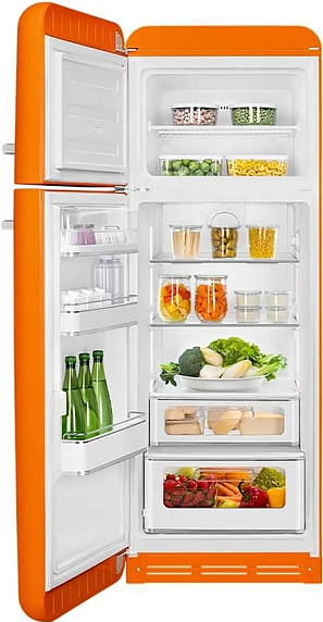 Холодильник Smeg FAB30LOR6 в оранжевом оттенке вдохновлён эстетикой 50-х годов и выполнен в классическом форм-факторе, поэтому он мгновенно становится центральным акцентом интерьера. Элегантная серебристая фурнитура подчёркивает плавные линии дверцы и идеально сочетается с насыщенной эмалью корпуса, создавая баланс винтажного шарма и современной аккуратности. Высота 172 см, ширина 60.1 см и глубина 72.8 см (78.8 см с ручкой) делают модель универсальной для разных планировок, обеспечивая вместительность без ущерба для эргономики. Общий объём 294 литра распределён таким образом, что холодильная камера вмещает 222 литра, а морозильная — 72 литра, позволяя организовать хранение продуктов разной природы и объёма.