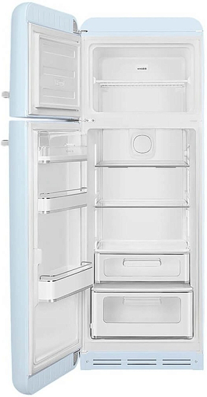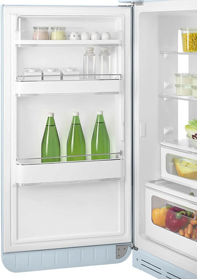 Холодильник Smeg FAB30LPB6 воплощённый в корпусе голубого цвета с серебристой фурнитурой, возвращает в интерьер нотки 50‑х годов и одновременно остаётся практичным современным прибором. Обтекаемые формы, аккуратная хромированная ручка и характерная фасадная панель формируют выразительный акцент, который легко становится центром внимания в любой кухонной зоне. Высота 172 см при ширине 60,1 см и глубине 72,8 см (78,8 см с ручкой) обеспечивает компактность по площади пола и достаточную вместительность для семьи, а общий объём 294 литра распределён так, чтобы ежедневные продукты и крупные заготовки находились под рукой. Внутреннее наполнение продумано с уклоном на удобство: холодильный отсек рассчитан на 222 л, морозильный — на 72 л, верхнее расположение камер облегчает доступ к часто используемым овощам и напиткам.