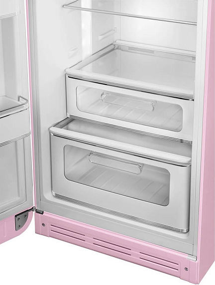 Холодильник Smeg FAB30LPK6 объединяет эстетическую философию пятидесятых с современными технологиями, превращая бытовую технику в выразительный элемент интерьера. Корпус нежно-розового цвета и фурнитура серебристого оттенка создают приятный контраст, который легко впишется в классическое пространство или станет ярким акцентом в минималистичной кухне. Отдельностоящий формат и традиционный форм-фактор подчёркивают узнаваемую коллекцию «Стиль 50-х годов», где каждая деталь рассчитана на гармонию внешнего вида и эксплуатационной надёжности. Высота 172 см при ширине 60,1 см и глубине 72,8 см (78,8 см с ручкой) обеспечивает вместительный интерьер при компактности габаритов и удобстве размещения в проходных зонах.